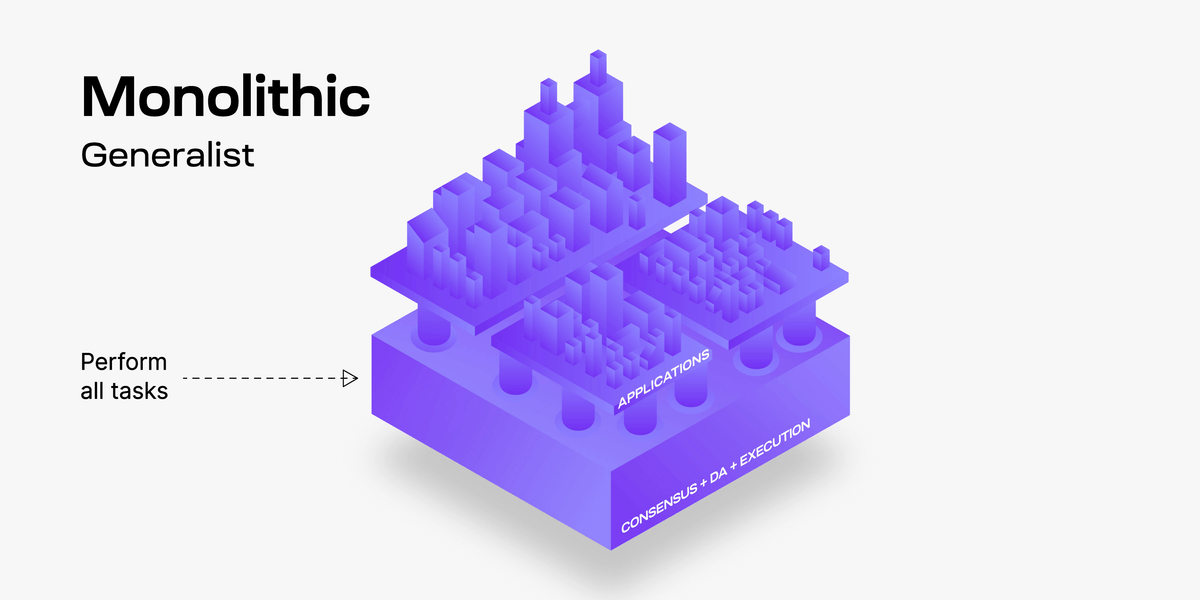 A monolithic chain is a generalist blockchain that performs all tasks. Really, the monolithic approach is “do everything yourself”.