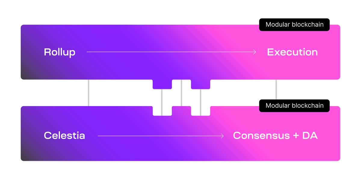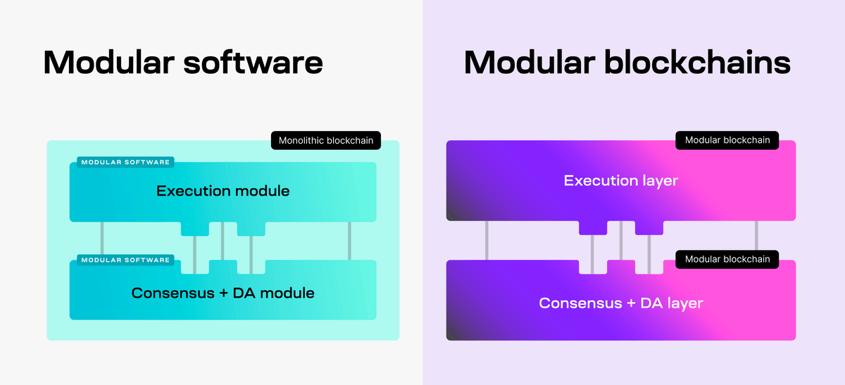 - Modular software separates the core functions of a blockchain among different pieces of software, enabling a more flexible and efficient blockchain development process.