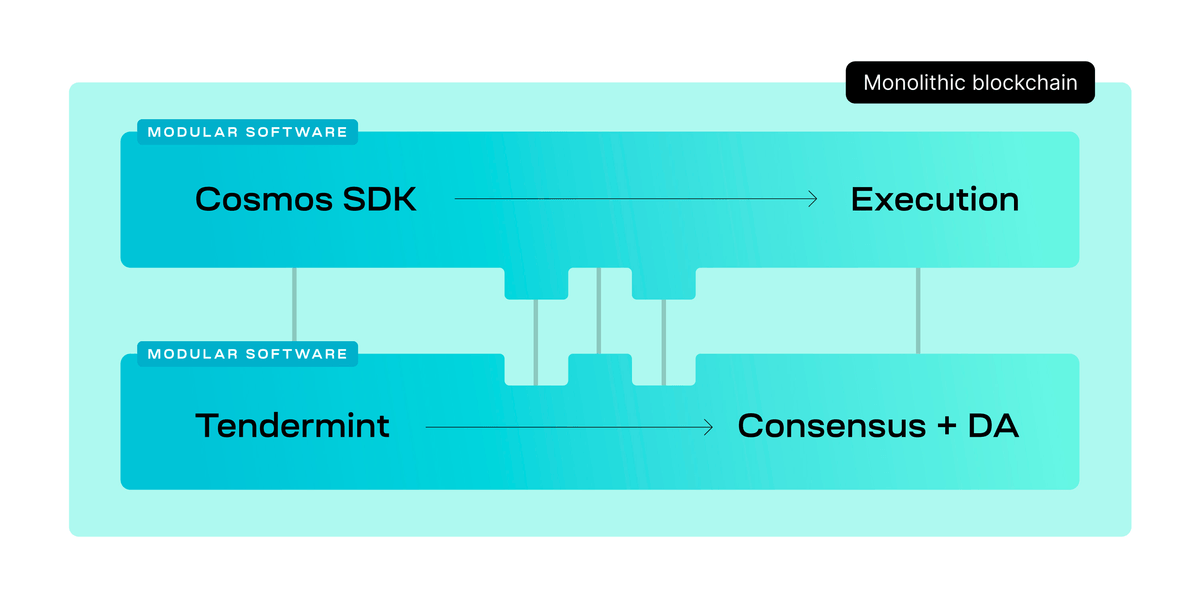 On the other hand, an example of modular software is Tendermint and the Cosmos SDK. Tendermint is the consensus software that validators run to produce new blocks. The Cosmos SDK is the execution environment that processes transactions. Together, Tendermint and the Cosmos SDK serve as a toolkit for building blockchains.