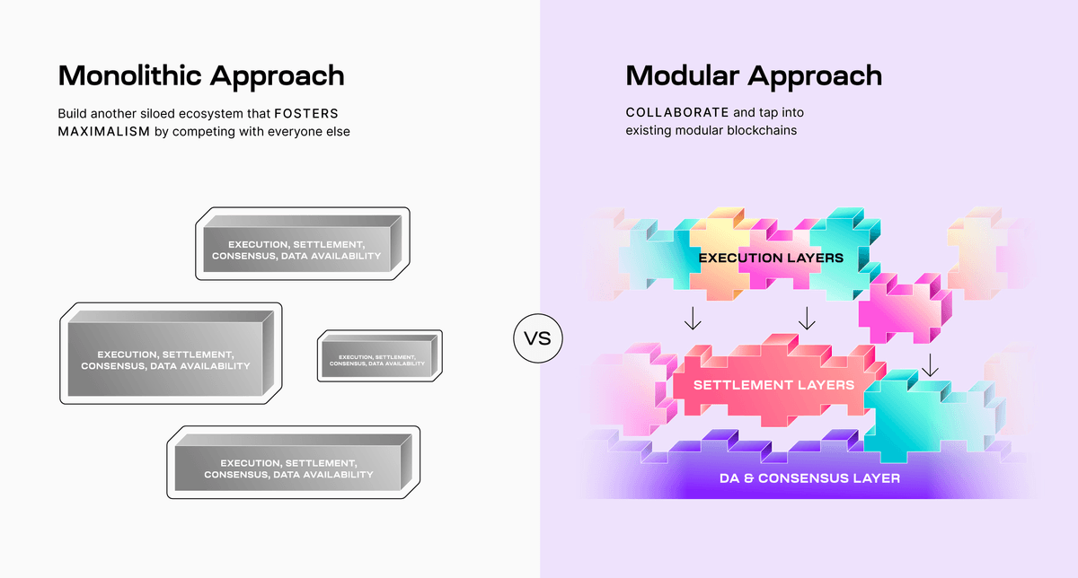Modular blockchains create a collaborative environment with many connected chains. Each new user that a modular blockchain brings in creates value for the whole modular ecosystem, not just a single L1. Modular blockchains collaborate while monolithic L1s compete.